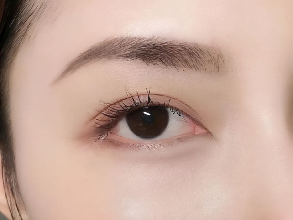 1.上下眼皮眼窝内用杏色眼影晕染,双眼皮褶皱内用深色眼影加深,卧蚕阴影弧度圆润,中间用高光提亮;