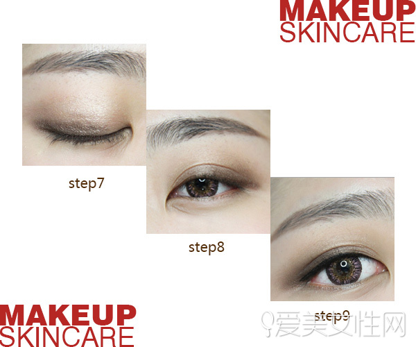 Step7 用晕染刷蘸取深棕色眼影,涂在睫毛根部及双眼皮褶皱线以内的位置,超出眼尾一些,达到拉长眼型的效果,注意不要超过眼珠中央。