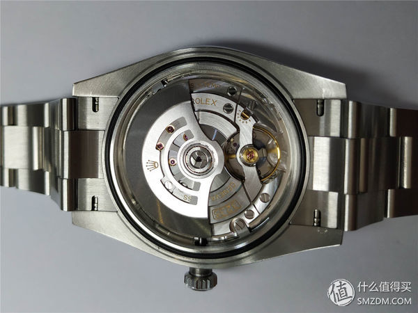 手表打开后盖,可以清晰的感受到新老机芯的变化差异,摆陀一体式设计,自动陀的镂空变大,多了劳力士的皇冠logo,继续采用防腐蚀的镀铑涂层,中心夹板圆纹拉丝给人一种新的体验;让视觉集中在中间的三角纹螺丝上,虽说蚝式表壳劳力士从来不做透底设计,但可以看到新机芯在设计上更具层次感和美观