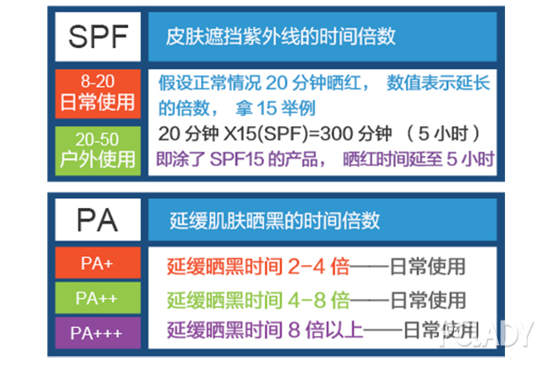 SPF指数代表对UVB的防御情况,即防晒伤能力;PA指数代表对UVA的防护情况,即防晒黑能力。