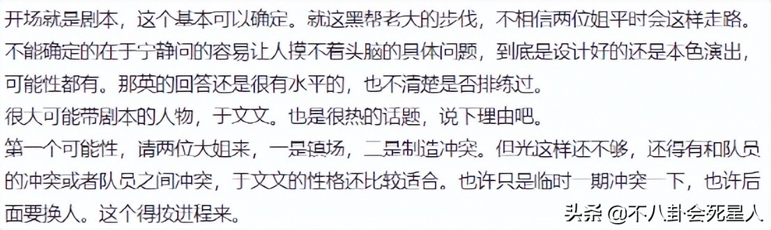 如果说其中没有芒果台的剧本安排,也很难说得过去,第一期尽是“恶魔剪辑”,而且于文文就像是主演一样,镜头非常地多。第二期明显就“开始洗白”,以及于文文硬凹出来的人设,表演痕迹实在是太重了。