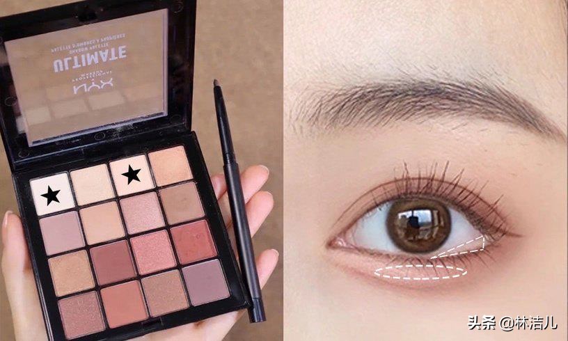 眼睑下至、卧蚕阴影都是使用收敛的深色画出来的,若不使用膨胀色提亮,很容易显得面部很平。因此想要拥有立体、自然感的眼妆,提亮步骤不可省。常见的NG画法,是使用纯白色提亮,不像原生肤色,同样会显得很刻意。大家可以将白色雾面色混合一点粉色眼影,除了再次提亮卧蚕之外,也可以涂抹在眼睑下至上方的三角区域,双眼就会立刻放大许多。
