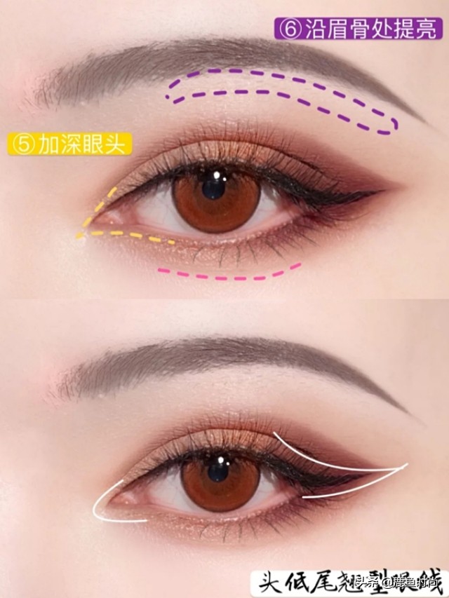 第三步:用眼影刷上剩下的眼影轻轻刷一下眼头,加深眼头,看起来眼头尖尖很有魅力。然后用高光沿着眉骨处提亮,凸显眉骨,让眼睛更加有深邃感~