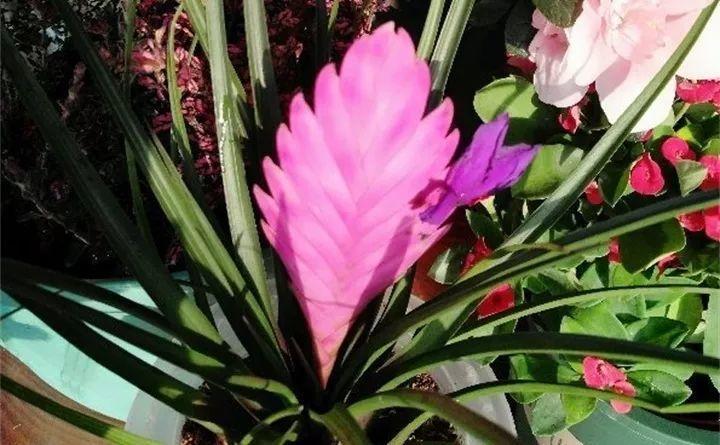 铁兰又叫紫花凤梨,也是观赏凤梨的一种,平时我们看到的花其实是它的苞片,它真正的花是蓝紫色的,着生在苞片之上。