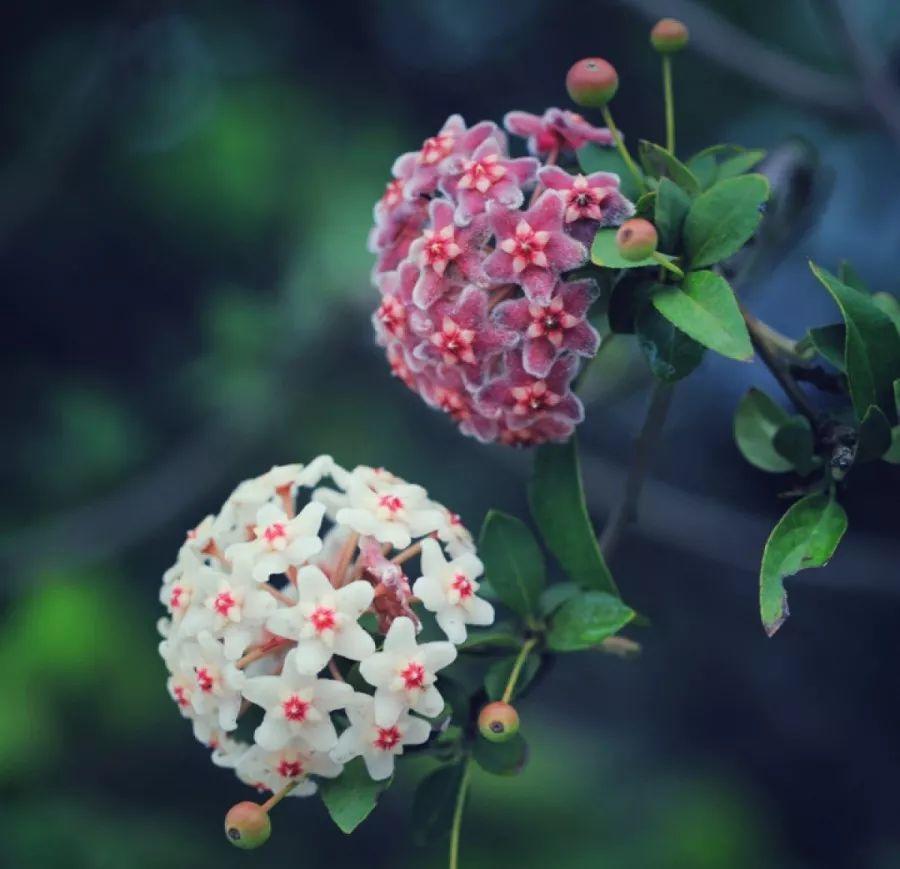 球兰的花很美,花开球形,刚开的小花朵像蜡质的五角星,花瓣打开后露出红色的花蕊,又像新鲜出炉的糕点,香气袭人。